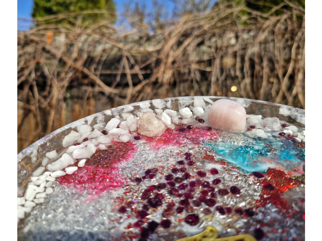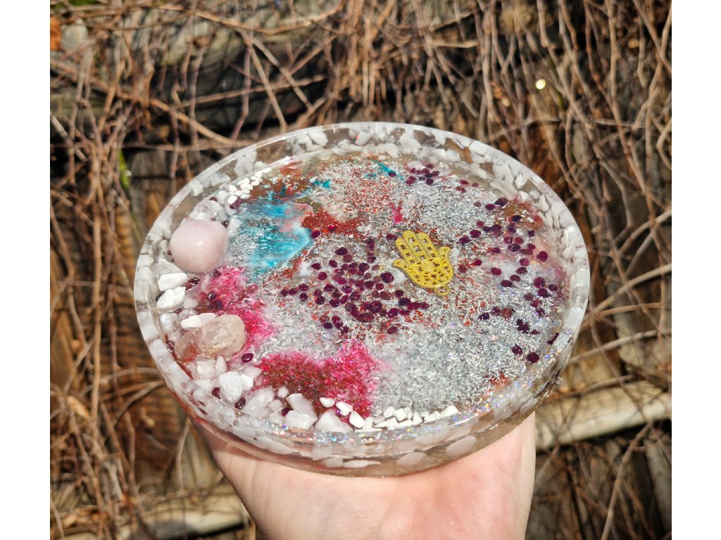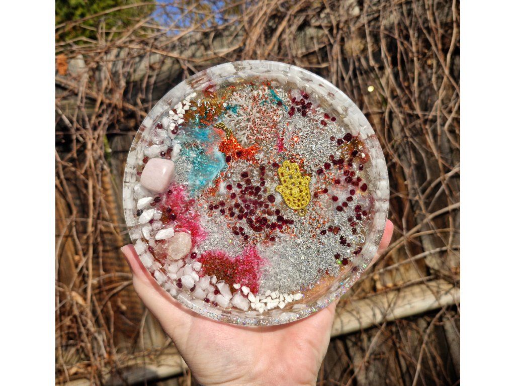 Domů VŠE ORGONITY PODTÁCKY Podtácek granát, růženín, křišťál, hamsa - velký
